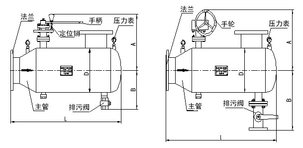 | 型號 | 公稱通徑 | 最大流量 | L(mm) | A | B | D | 排污口 | 重量Kg | |||||