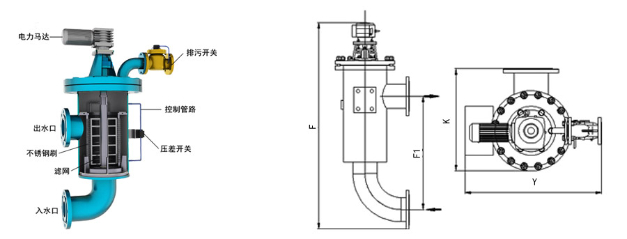 | 型號 | 管徑 | 出入水口 | F | F1 | Y | K | 濾網(wǎng)面積 | 處理水量 | 重量 |