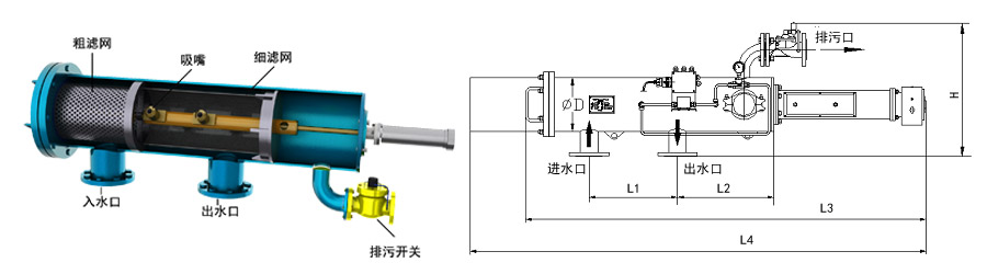 | 型號 | 管徑 | 出入水口 | L1 | L2 | L3 | L4 | H | d | 濾網(wǎng)面積 | 處理水量 | 重量 |
